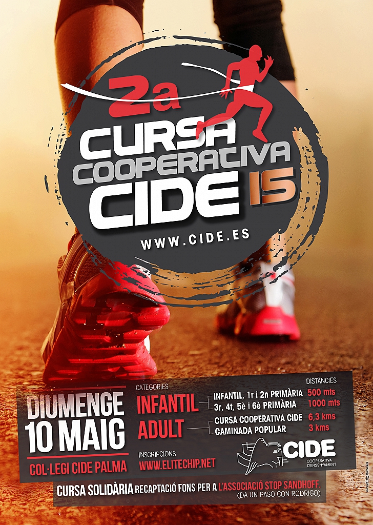 1) El Col·legi CIDE Cooperativa organitza una cursa i una caminada solidàries per a l'10 de maig, a benefici de la Asociació Stop-sandhoff (Da un paso Rodrigo), amb una longitud prevista de 6 i 3 km aproximadament cadascuna.