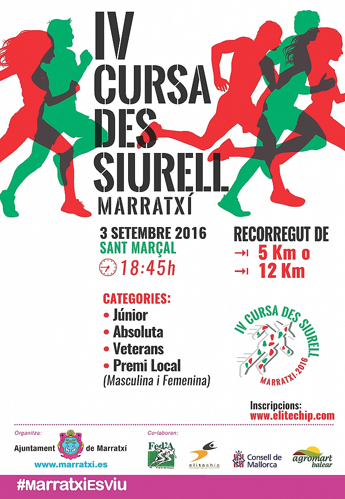 Article 1. Organització. - L’Ajuntament de Marratxí organitza la IV Cursa des Siurell de Marratxí, amb la col.laboració tècnica del Club Marathon Mallorca, que tindrà lloc el proper 3 de setembre de 2016, a partir de les 18.45 hores.