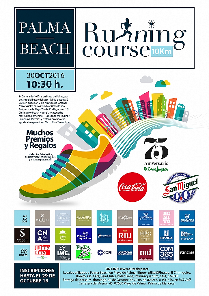 1ª Carrera de 10 Kms en Playa de Palma, por delante del Paseo del Mar. Salida desde MG Café en dirección Club Náutico de S’Arenal “CNA” vuelta hasta Club Marítimo San Antonio de la Playa “CMSAP” y llegada en “El Chiringuito Beach House” . 8 categorías Masculino/Femenina + absoluta Masculina / Femenina. Premios y trofeos en cada categoría a los ganadores Masculino / Femenina.