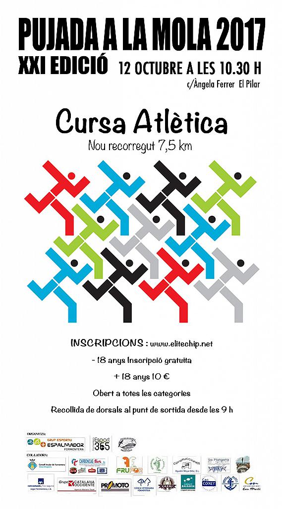 La prova anomenada “PUJADA A LA MOLA”, es celebrarà Al Pilar de la Mola, localitat de Formentera el 12/10/2017 a les 10:30, i es tracta d’una prova de atletismo de montanya de 7,5kms de distancia i FEDERADA a la FAIB.