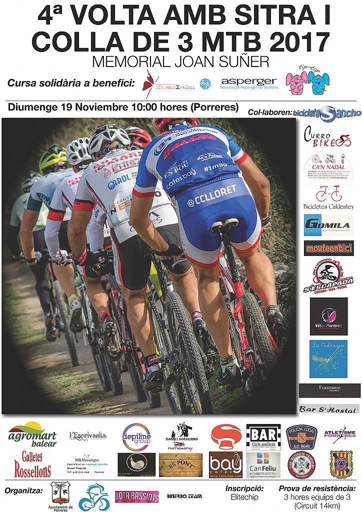 L'ajuntament de Porreres, la Penya ciclista de Porreres, Binerbo Team i Bota Bassiots organitzen “la 4ª Volta amb Sitra i Colla de Tres MTB. Memorial Joan Suñer” el diumenge 19 de Novembre a les 10:00 hores a Porreres. Es tracte d’una cursa de MTB de caire popular per colla de tres, que consisteix en donar el nombre màxim de voltes al recorregut durant un temps de Tres hores.